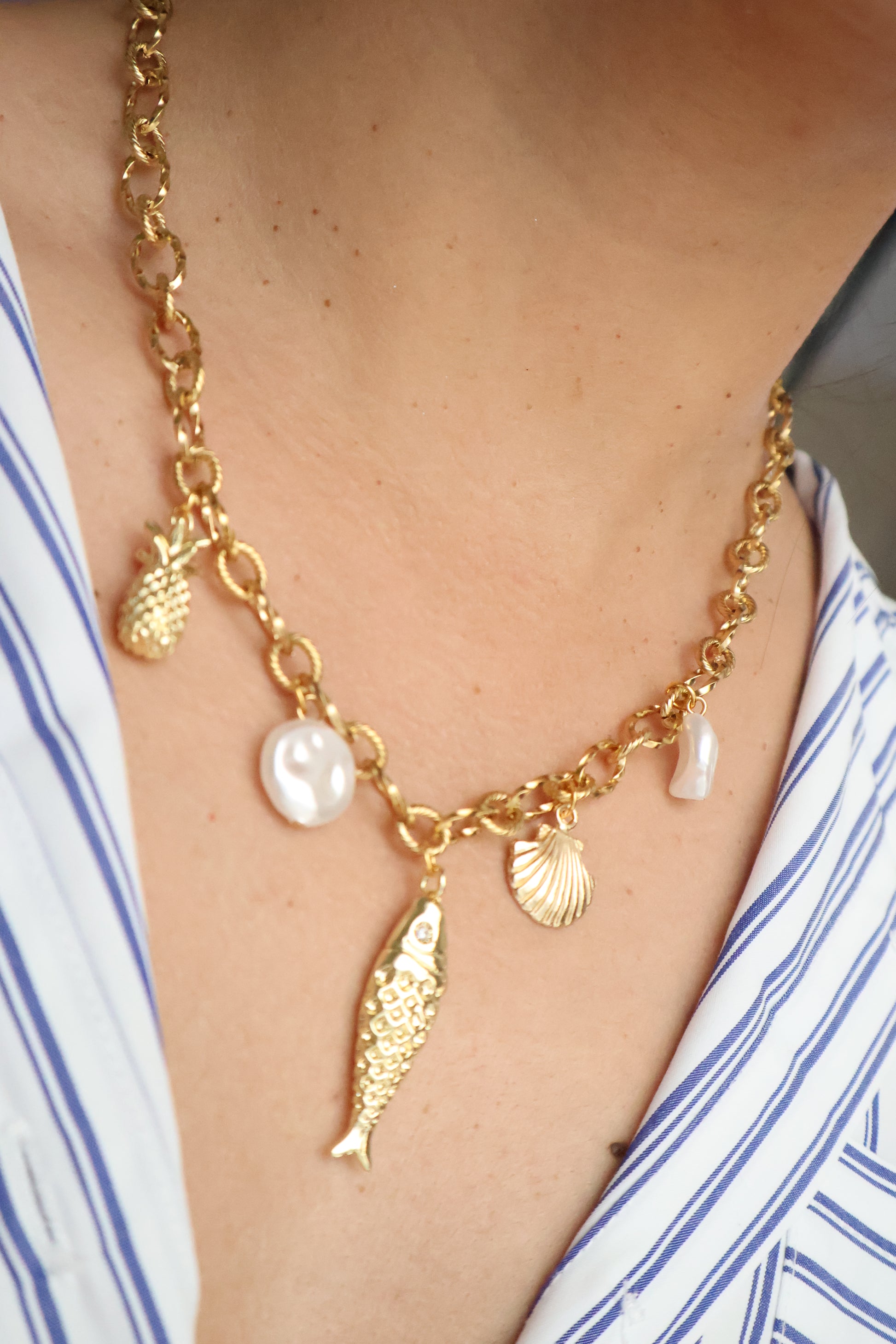 Este collar con charms marinos está inspirado en la vibrante ciudad de Cartagena, Colombia. Fabricado en acero inoxidable de alta calidad, ofrece resistencia al desgaste y un acabado duradero que mantiene su brillo con el tiempo. Su diseño cuidado refleja la esencia costera y cultural de Cartagena, ideal para quienes buscan una pieza elegante que evoque recuerdos y conexión con esta hermosa ciudad. Perfecto para uso diario o como un regalo significativo.
