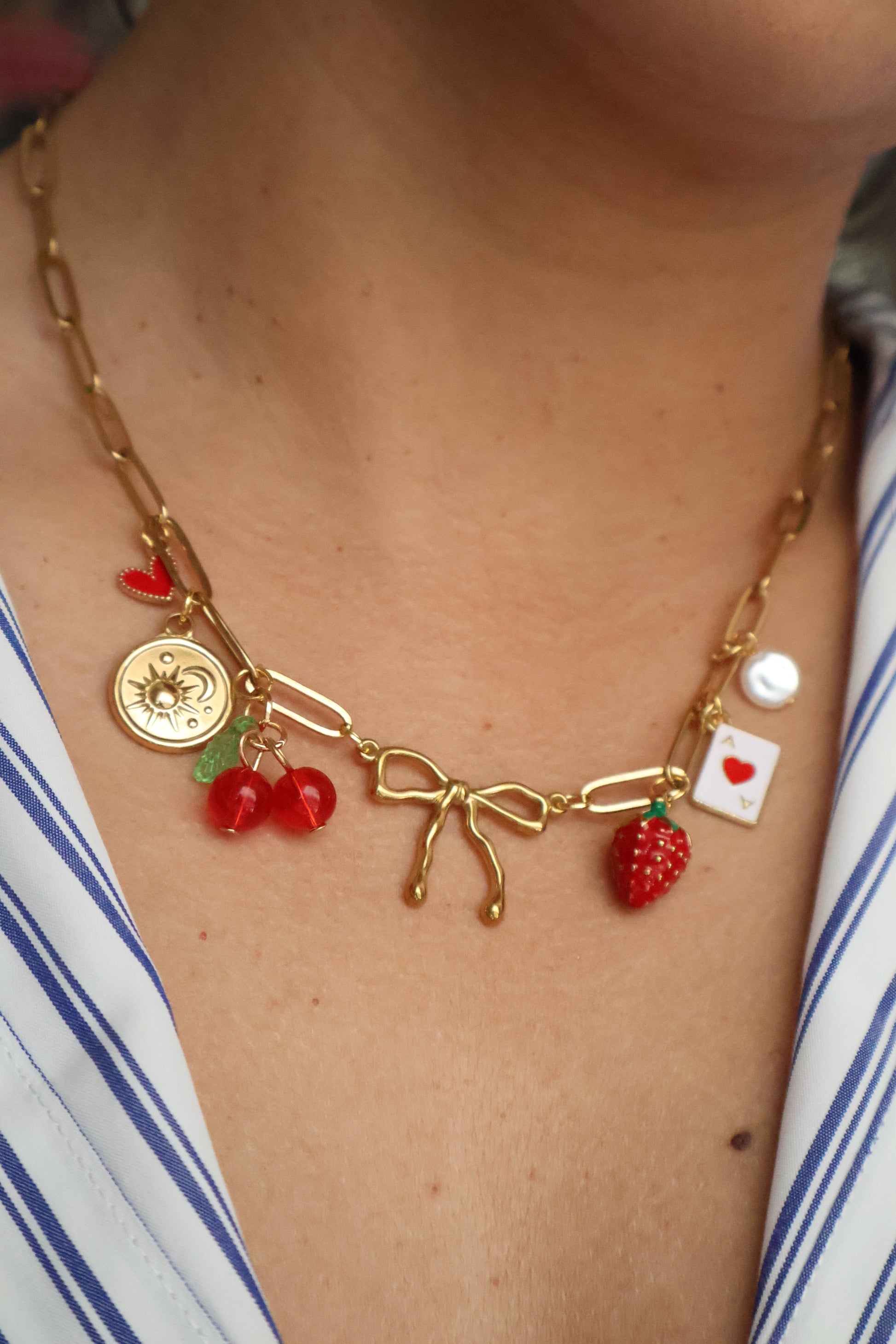 Este collar de acero inoxidable combina diversión y sabor con encantadores tonos rojos y detalles de frutas como fresa y cereza. Llamado "Merengón", evoca ese dulce colombiano que todos amamos, agregando un toque alegre y único a tu estilo diario. Perfecto para quienes disfrutan de accesorios con un guiño dulce y colorido.