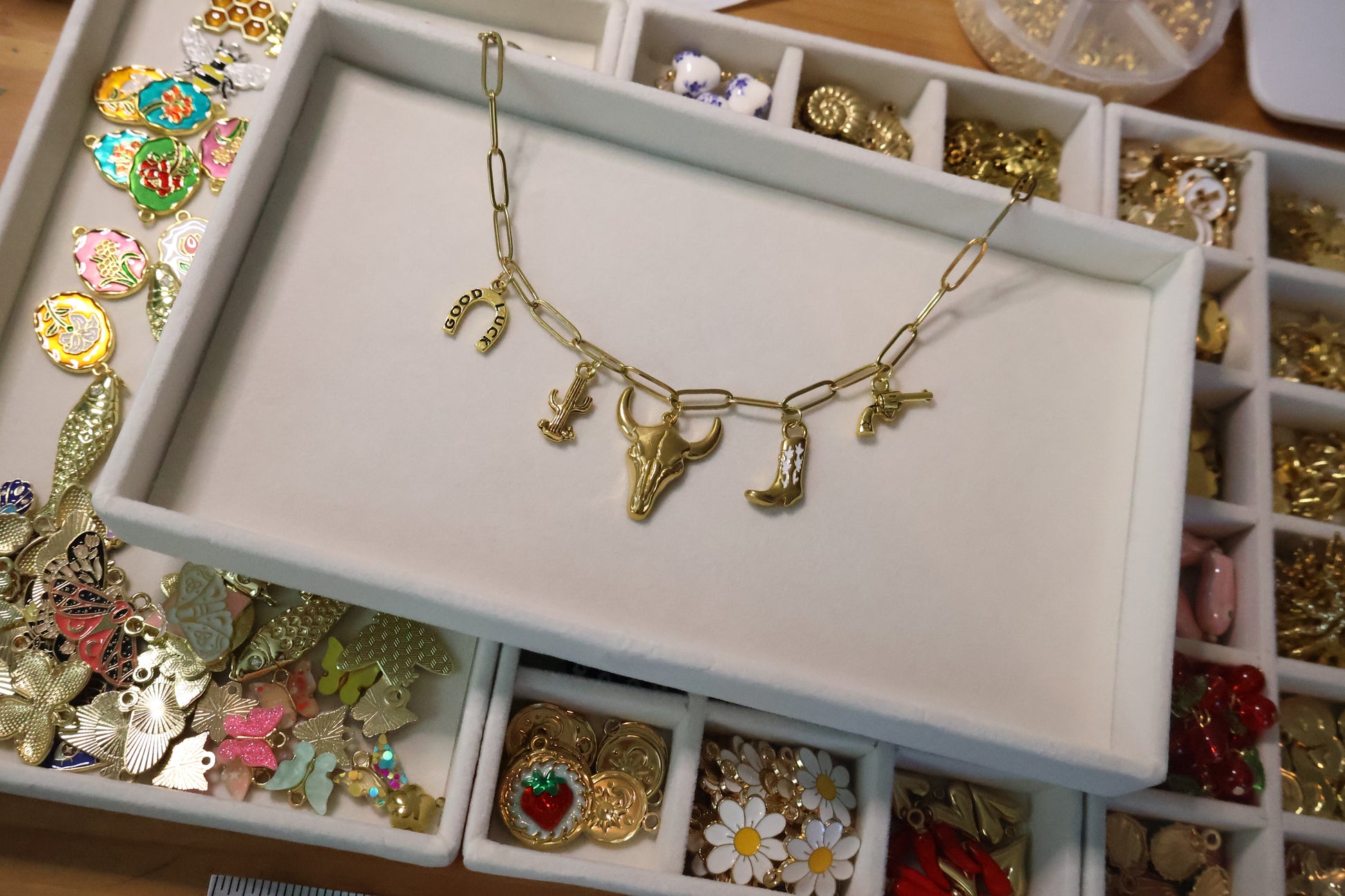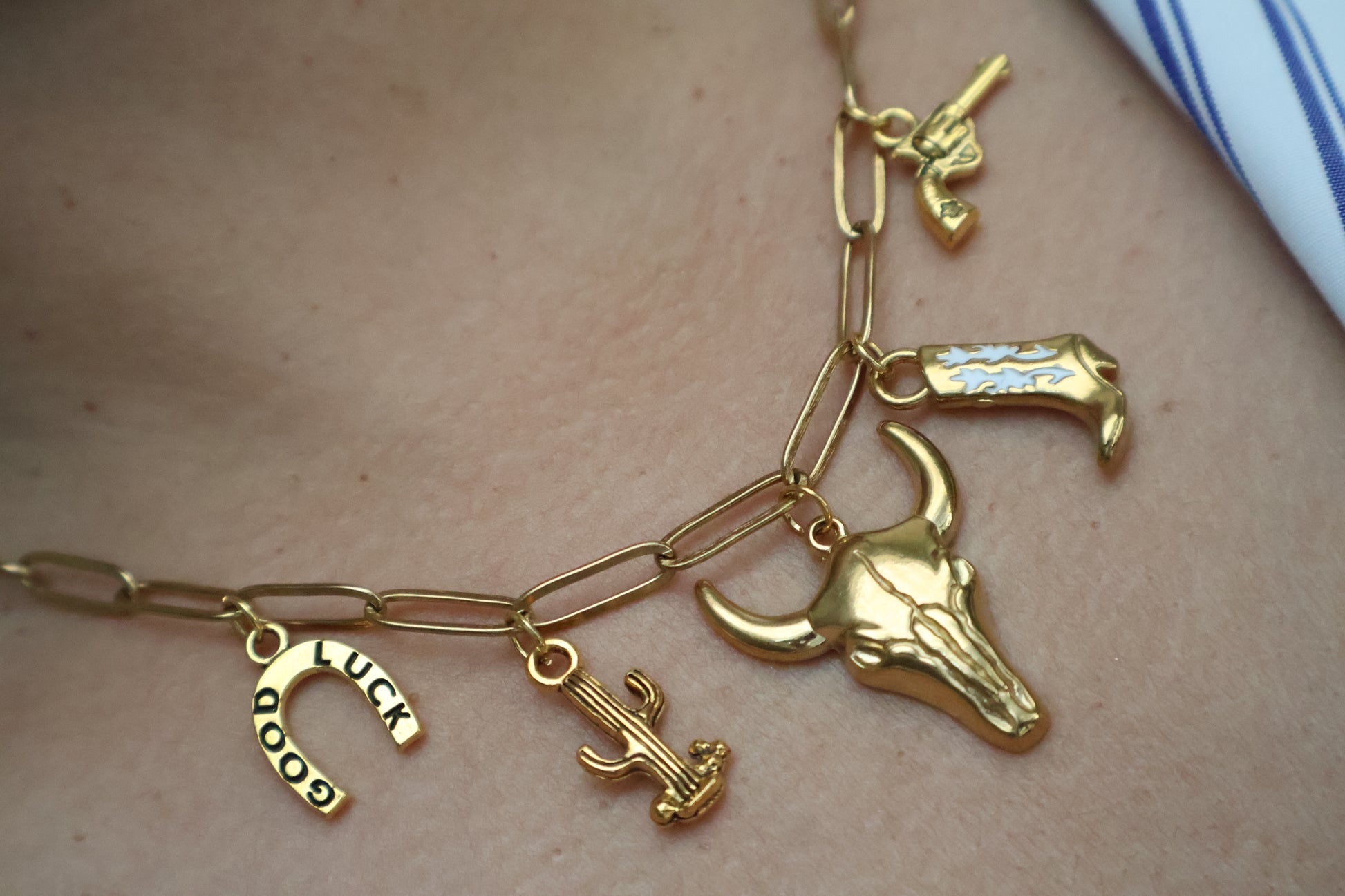 Add a touch of Texas charm to your look with this playful Collar Charms River Walk. Inspired by the vibrant spirit of Texas and the iconic San Antonio River Walk, each charm captures the essence of local culture and scenic beauty. Perfect for adventurers and dreamers, this necklace brings a fun and unique flair to any outfit. Celebrate the Lone Star State wherever you go!